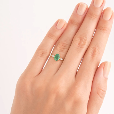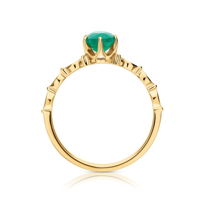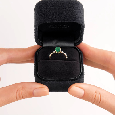 Кольцо с 6 бриллиантами природными, 0.03 карат, огранка круг 17 граней, цвет 2, чистота 2, тип огранки А; 1 изумрудом природным, 0.69 карат, цвет 3, чистота 3, тип огранки Б; Желтое золото 585 пробы.