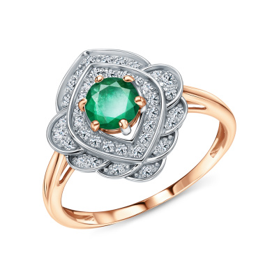 Кольцо с 2 бриллиантами природными, 0.01 карат, огранка круг 57 граней, цвет 3, чистота 6, тип огранки А; 36 бриллиантами природными, 0.17 карат, огранка круг 17 граней, цвет 2, чистота 2, тип огранки А; 1 изумрудом природным, 0.44 карат, цвет 3, чистота 3, тип огранки В; Розовое золото 585 пробы.