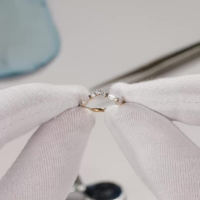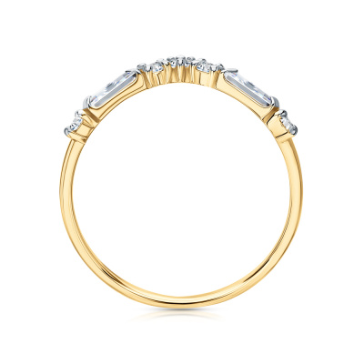 Кольцо с 2 бриллиантами выращенными, 0.2 карат, огранка багет 33 грани, цвет 3, чистота 6, тип огранки А; 5 бриллиантами выращенными, 0.16 карат, огранка круг 57 граней, цвет 3, чистота 6, тип огранки А; Желтое золото 585 пробы.