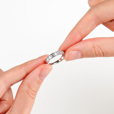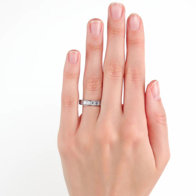 Кольцо с 8 бриллиантами выращенными, 0.39 карат, огранка багет 33 грани, цвет 3, чистота 6, тип огранки А; 18 бриллиантами выращенными, 0.13 карат, огранка круг 57 граней, цвет 3, чистота 6, тип огранки А; Белое золото 585 пробы.