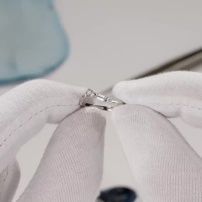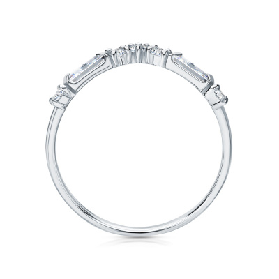 Кольцо с 2 бриллиантами выращенными, 0.23 карат, огранка багет 33 грани, цвет 3, чистота 6, тип огранки А; 5 бриллиантами выращенными, 0.16 карат, огранка круг 57 граней, цвет 3, чистота 6, тип огранки А; Белое золото 585 пробы.