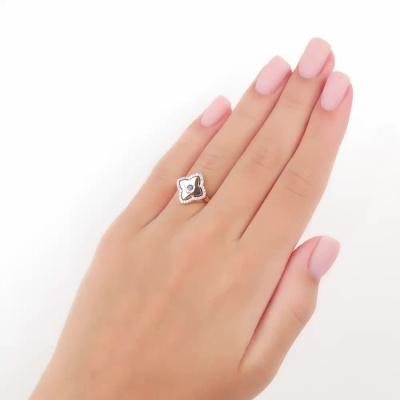Кольцо с 32 бриллиантами природными, 0.12 карат, огранка круг 17 граней, цвет 2, чистота 2, тип огранки А; 1 сапфиром природным, 0.07 карат, цвет 2, чистота 2, тип огранки В; Розовое золото 585 пробы.