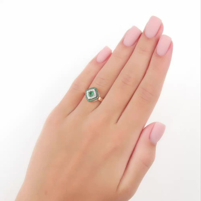 Кольцо с 12 бриллиантами природными, 0.1 карат, огранка круг 17 граней, цвет 2, чистота 2, тип огранки А; 1 изумрудом природным, 0.25 карат, цвет 3, чистота 3, тип огранки В; 24 изумрудами природными, 0.08 карат, цвет 3, чистота 3, тип огранки В; Розовое золото 585 пробы.