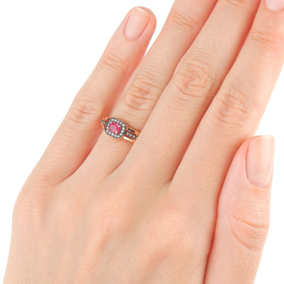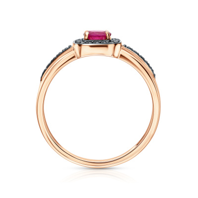 Кольцо с 1 рубином природным, 0.19 карат, цвет 2, чистота 2, тип огранки Б; 28 бриллиантами коньячными природными, 0.06 карат, огранка круг 57 граней, цвет 7, чистота 5, тип огранки А; Розовое золото 585 пробы.