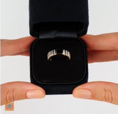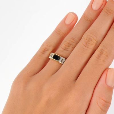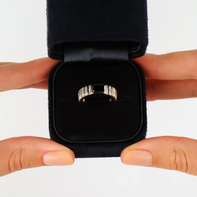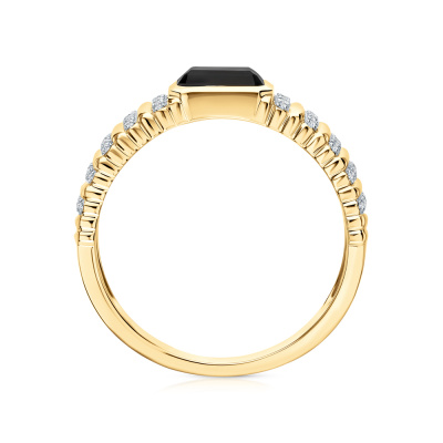 Кольцо с 60 бриллиантами природными, 0.131 карат, огранка круг 17 граней, цвет 2, чистота 3; 1 агатом черным природным; Желтое золото 585 пробы.