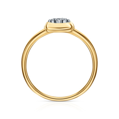 Кольцо с 1 бриллиантом природным, 0.01 карат, огранка круг 57 граней, цвет 3, чистота 6, тип огранки А; 8 бриллиантами природными, 0.01 карат, огранка круг 17 граней, цвет 2, чистота 2, тип огранки А; Желтое и белое золото 585 пробы.