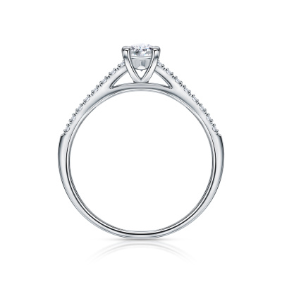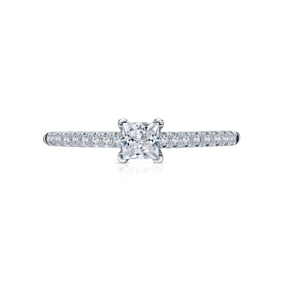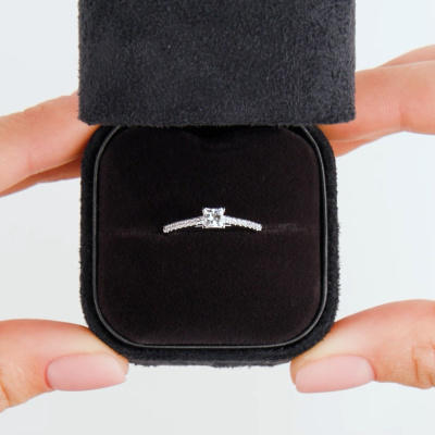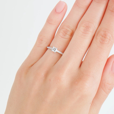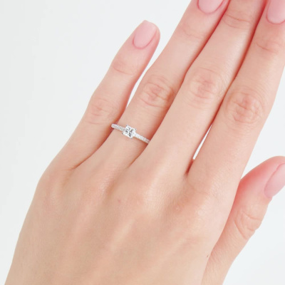 Кольцо с 1 бриллиантом природным, 0.24 карат, огранка принцесса 65 граней, цвет 3, чистота 6, тип огранки А; 16 бриллиантами природными, 0.08 карат, огранка круг 57 граней, цвет 3, чистота 6, тип огранки А; Белое золото 585 пробы.