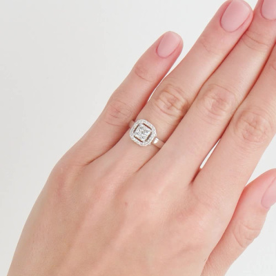 Кольцо с 4 бриллиантами природными, 0.17 карат, огранка круг 57 граней, цвет 3, чистота 6, тип огранки А; 1 бриллиантом природным, 0.01 карат, огранка круг 57 граней, цвет 3, чистота 6, тип огранки А; 22 бриллиантами природными, 0.09 карат, огранка круг 17 граней, цвет 2, чистота 2, тип огранки А; 4 бриллиантами природными, 0.009 карат, огранка круг 17 граней, цвет 2, чистота 2, тип огранки Б; Белое золото 585 пробы.