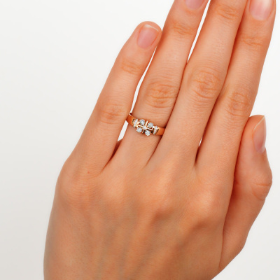 Кольцо с 1 бриллиантом природным, 0.01 карат, огранка круг 57 граней, цвет 3, чистота 6, тип огранки А; 4 бриллиантами природными, 0.01 карат, огранка круг 17 граней, цвет 2, чистота 2, тип огранки А; 6 бриллиантами природными, 0.01 карат, огранка круг 17 граней, цвет 2, чистота 2, тип огранки А; Розовое и белое золото 585 пробы.