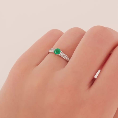 Кольцо с 10 бриллиантами природными, 0.06 карат, огранка круг 57 граней, цвет 3, чистота 6, тип огранки А; 1 изумрудом природным, 0.23 карат, цвет 3, чистота 3, тип огранки В; Белое золото 585 пробы.