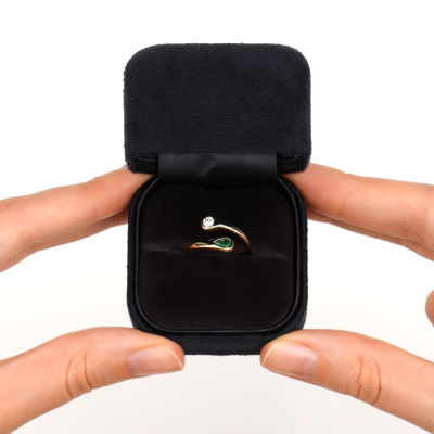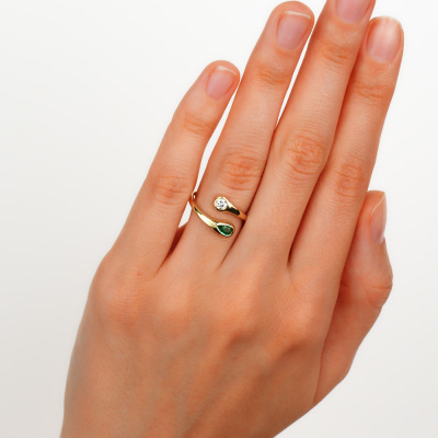 Кольцо с 1 бриллиантом природным, 0.17 карат, огранка круг 57 граней, цвет 3, чистота 6, тип огранки А; 1 изумрудом природным, 0.15 карат, цвет 3, чистота 3, тип огранки Б; Желтое золото 585 пробы.