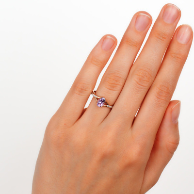 Кольцо с 10 бриллиантами природными, 0.05 карат, огранка круг 17 граней, цвет 2, чистота 2, тип огранки А; 1 аметистом природным, 0.65 карат; Розовое золото 585 пробы.