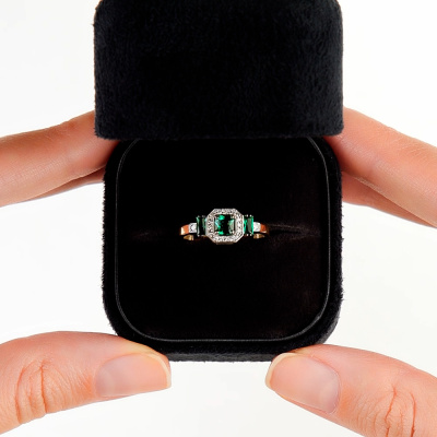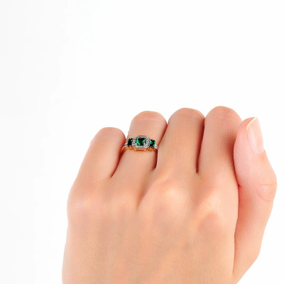 Кольцо с 2 бриллиантами природными, 0.01 карат, огранка круг 17 граней, цвет 2, чистота 2, тип огранки Б; 16 бриллиантами природными, 0.06 карат, огранка круг 17 граней, цвет 2, чистота 2, тип огранки А; 1 гидротермальным изумрудом, 0.28 карат; 2 гидротермальными изумрудами, 0.2 карат; Желтое золото 585 пробы.