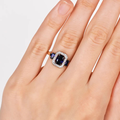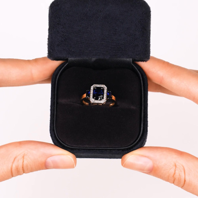 Кольцо с 24 бриллиантами природными, 0.09 карат, огранка круг 17 граней, цвет 2, чистота 2, тип огранки А; 1 сапфиром синтетическим, 0.91 карат; 2 сапфирами синтетическими, 0.25 карат; Розовое золото 585 пробы.