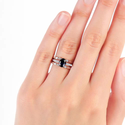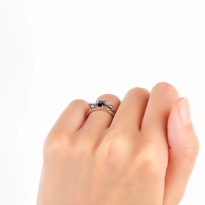 Кольцо с 10 бриллиантами природными, 0.09 карат, огранка круг 57 граней, цвет 3, чистота 6, тип огранки А; 1 сапфиром синтетическим, 0.9 карат; Белое золото 585 пробы.