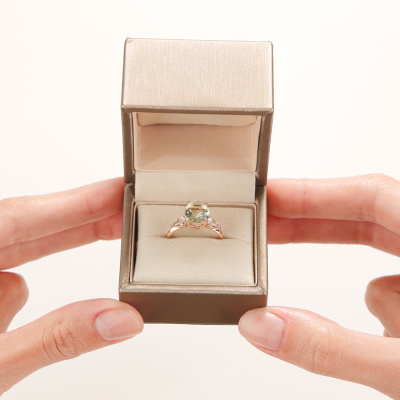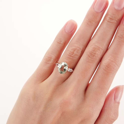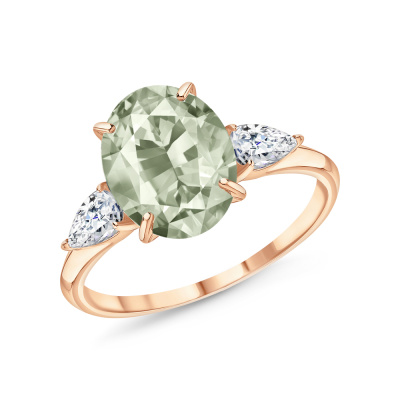 Кольцо с 1 празиолитом природным, 1.4 карат; 2 кварцами бесцветными природными, 0.34 карат; Розовое золото 585 пробы.