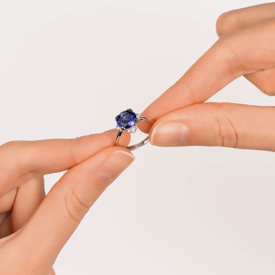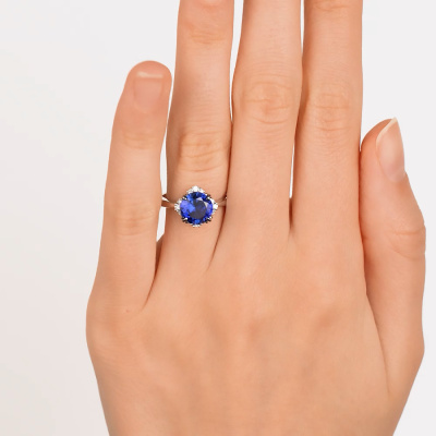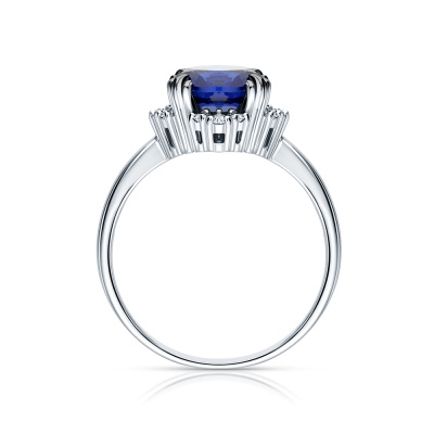 Кольцо с 1 сапфиром выращенным, 2.41 карат; 4 бриллиантами выращенными, 0.05 карат, огранка круг 57 граней, цвет 3, чистота 6, тип огранки А; 8 бриллиантами выращенными, 0.05 карат, огранка круг 57 граней, цвет 3, чистота 6, тип огранки А; Белое золото 585 пробы.