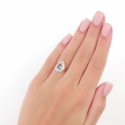 Кольцо с 16 бриллиантами природными, 0.03 карат, огранка круг 17 граней, цвет 2, чистота 2, тип огранки А; 1 топазом скай природным, 1.9 карат; Розовое золото 585 пробы.