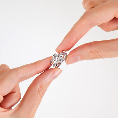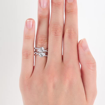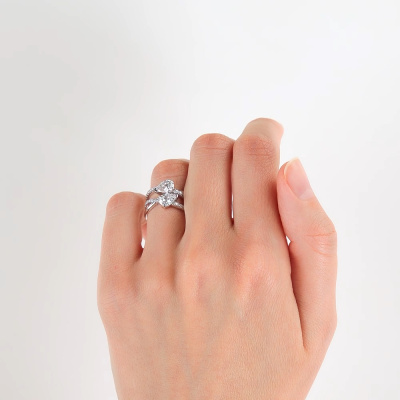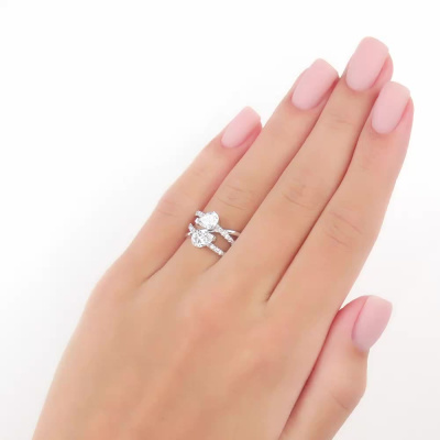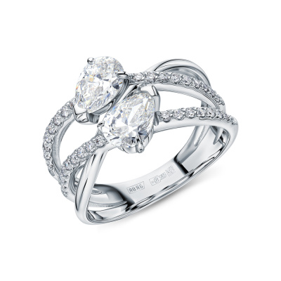 Кольцо с 2 бриллиантами выращенными, 1.28 карат, огранка груша 56 граней, цвет 4, чистота 5, тип огранки А; 34 бриллиантами выращенными, 0.25 карат, огранка круг 57 граней, цвет 3, чистота 5, тип огранки А; Белое золото 585 пробы.