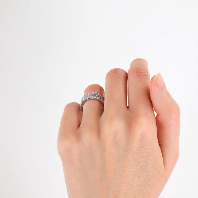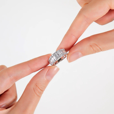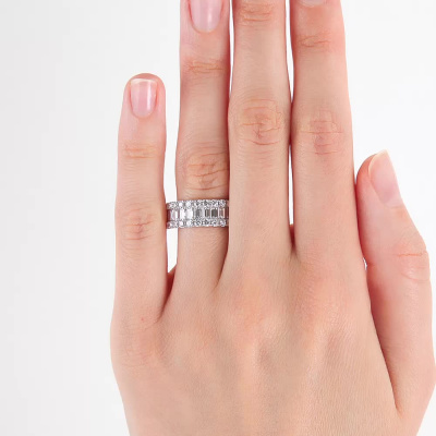 Кольцо с 13 бриллиантами выращенными, 1.16 карат, огранка багет 33 грани, цвет 3, чистота 5, тип огранки А; 26 бриллиантами выращенными, 0.75 карат, огранка круг 57 граней, цвет 3, чистота 5, тип огранки А; Белое золото 585 пробы.