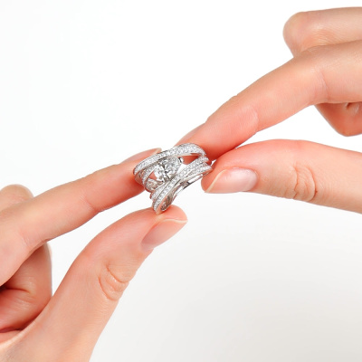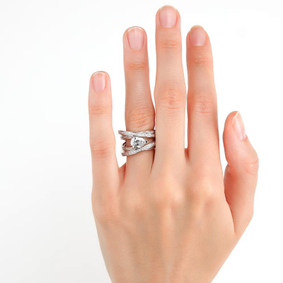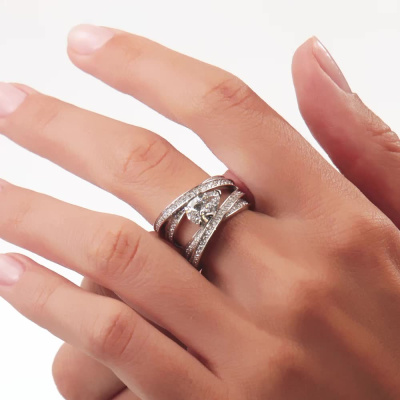 Кольцо с 1 бриллиантом выращенным, 1.07 карат, огранка груша 56 граней, цвет 4, чистота 5, тип огранки А; 106 бриллиантами выращенными, 0.59 карат, огранка круг 57 граней, цвет 3, чистота 6, тип огранки А; 10 бриллиантами выращенными, 0.03 карат, огранка круг 57 граней, цвет 3, чистота 5, тип огранки А; 4 бриллиантами выращенными, 0.008 карат, огранка круг 57 граней, цвет 3, чистота 5, тип огранки А; Белое золото 585 пробы.