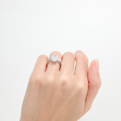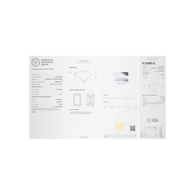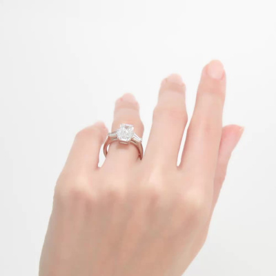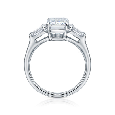 Кольцо с 1 бриллиантом выращенным, 3.26 карат, огранка изумрудная 65 граней, цвет 4, чистота 5, тип огранки А; 2 бриллиантами выращенными, 0.49 карат, огранка багет 25 граней, цвет 3, чистота 5, тип огранки А; Белое золото 585 пробы.