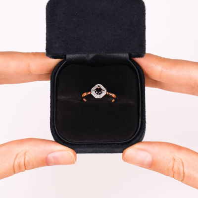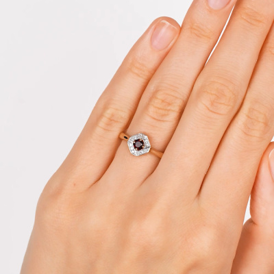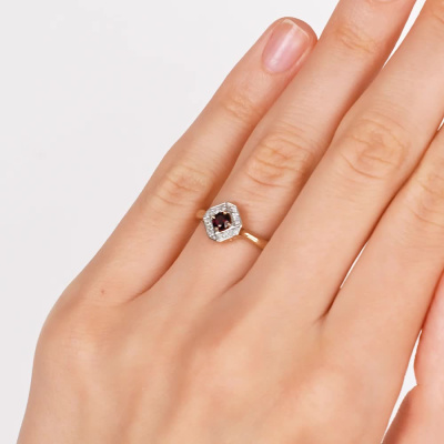 Кольцо с 12 бриллиантами природными, 0.05 карат, огранка круг 17 граней, цвет 2, чистота 2; 1 гранатом природным, 0.22 карат; Розовое золото 375 пробы.