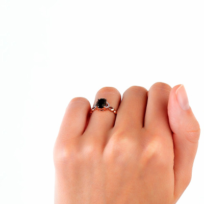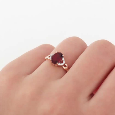 Кольцо с 10 бриллиантами природными, 0.04 карат, огранка круг 17 граней, цвет 2, чистота 2; 1 гранатом природным, 1.38 карат; Розовое золото 375 пробы.