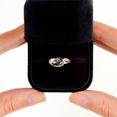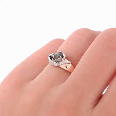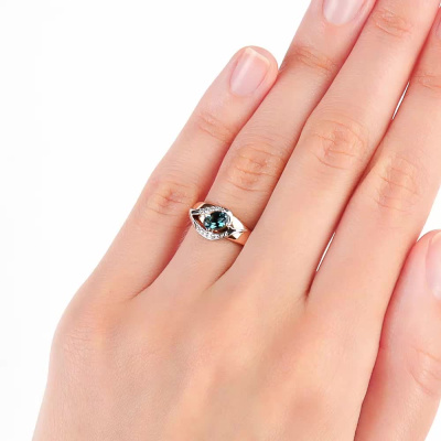 Кольцо с 7 бриллиантами природными, 0.03 карат, огранка круг 17 граней, цвет 2, чистота 2; 1 топазом лондон природным, 0.53 карат; Розовое и белое золото 375 пробы.