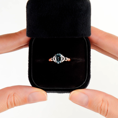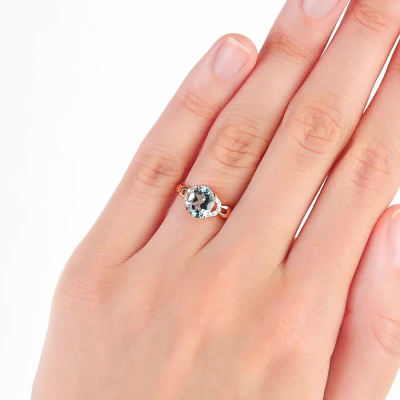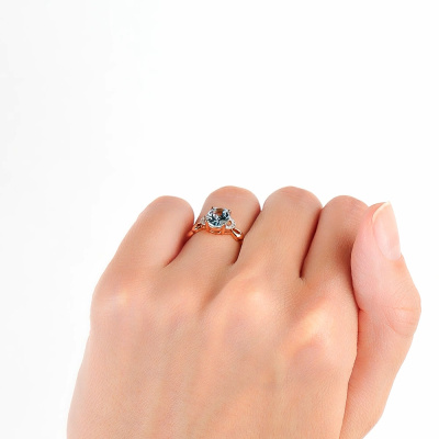 Кольцо с 10 бриллиантами природными, 0.04 карат, огранка круг 17 граней, цвет 2, чистота 2; 1 топазом скай природным, 1.42 карат; Розовое золото 375 пробы.