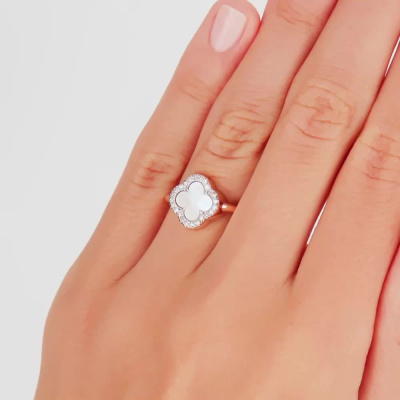 Кольцо с 24 бриллиантами природными, 0.09 карат, огранка круг 17 граней, цвет 2, чистота 2, тип огранки А; 1 перламутром белым природным, 1.01 карат; Розовое золото 585 пробы.