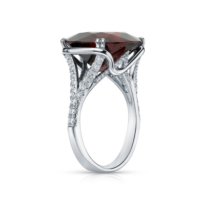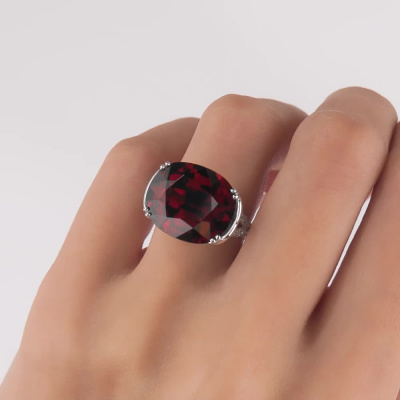 Кольцо с 6 бриллиантами природными, 0.08 карат, огранка круг 57 граней, цвет 3, чистота 6, тип огранки А; 24 бриллиантами природными, 0.14 карат, огранка круг 57 граней, цвет 3, чистота 6, тип огранки А; 26 бриллиантами природными, 0.04 карат, огранка круг 57 граней, цвет 3, чистота 6, тип огранки А; 1 гранатом спессартином природным, 15.14 карат; Белое золото 585 пробы.