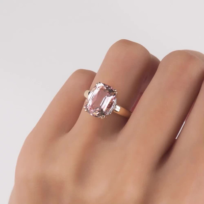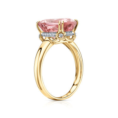 Кольцо с 4 бриллиантами природными, 0.01 карат, огранка круг 57 граней, цвет 3, чистота 6, тип огранки А; 14 бриллиантами природными, 0.03 карат, огранка круг 57 граней, цвет 3, чистота 6, тип огранки А; 1 турмалином розовым природным, 4.89 карат; Желтое золото 585 пробы.
