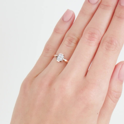 Кольцо с 6 бриллиантами природными, 0.11 карат, огранка круг 57 граней, цвет 3, чистота 6, тип огранки А; 2 бриллиантами природными, 0.01 карат, огранка круг 57 граней, цвет 3, чистота 6, тип огранки А; 6 бриллиантами природными, 0.01 карат, огранка круг 17 граней, цвет 2, чистота 2, тип огранки А; Розовое золото 585 пробы.