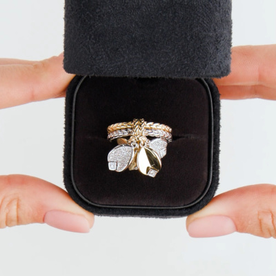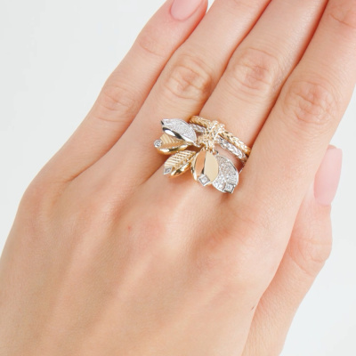 Кольцо с 5 бриллиантами природными, 0.07 карат, огранка круг 57 граней, цвет 3, чистота 6, тип огранки А; 14 бриллиантами природными, 0.1 карат, огранка круг 57 граней, цвет 3, чистота 6, тип огранки А; 58 бриллиантами природными, 0.13 карат, огранка круг 57 граней, цвет 3, чистота 6, тип огранки А; Желтое и белое золото 585 пробы.