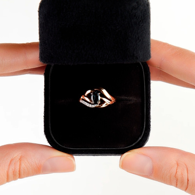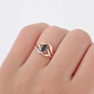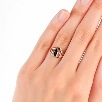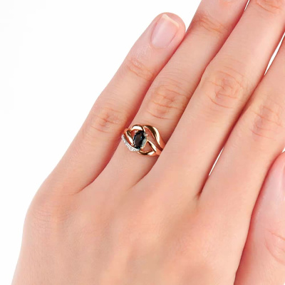 Кольцо с 7 бриллиантами природными, 0.02 карат, огранка круг 17 граней, цвет 2, чистота 2; 1 топазом лондон природным, 0.52 карат; Розовое золото 375 пробы.