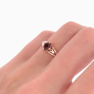 Кольцо с 2 бриллиантами природными, 0.01 карат, огранка круг 57 граней, цвет 3, чистота 6; 1 гранатом природным, 0.62 карат; Розовое золото 375 пробы.