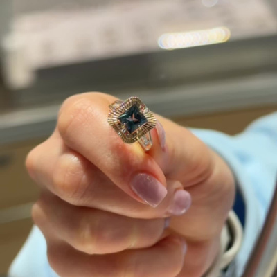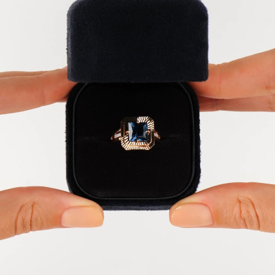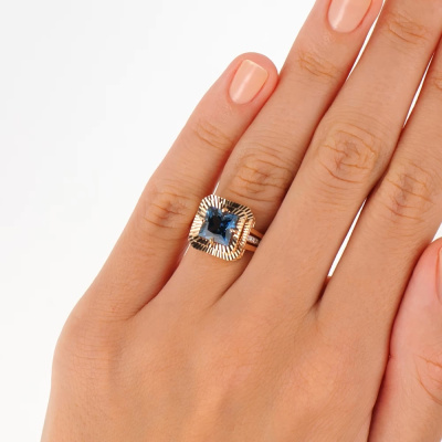 Кольцо с 8 бриллиантами природными, 0.04 карат, огранка круг 17 граней, цвет 2, чистота 2; 1 топазом лондон природным, 2.15 карат; Розовое золото 585 пробы.