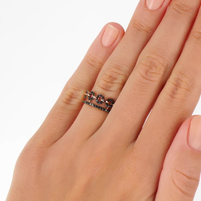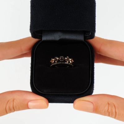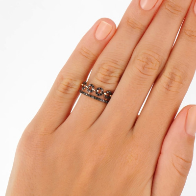 Кольцо с 53 бриллиантами черными природными облагороженными, 0.24 карат, огранка круг 57 граней, цвет 7, чистота 6, тип огранки А; Розовое золото 585 пробы.