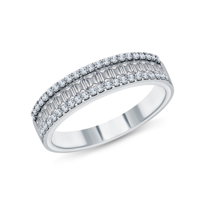Кольцо с 17 бриллиантами природными, 0.68 карат, огранка багет 33 грани, цвет 3, чистота 4, тип огранки А; 46 бриллиантами природными, 0.28 карат, огранка круг 57 граней, цвет 3, чистота 4, тип огранки А; Белое золото 585 пробы.