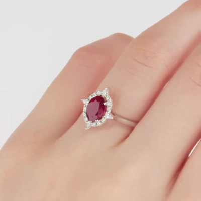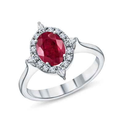 Кольцо с 4 бриллиантами природными, 0.11 карат, огранка груша 56 граней, цвет 3, чистота 4, тип огранки А; 12 бриллиантами природными, 0.16 карат, огранка круг 57 граней, цвет 3, чистота 4, тип огранки А; 1 рубином природным, 1.87 карат, цвет 2, чистота 2, тип огранки Б; Белое золото 585 пробы.