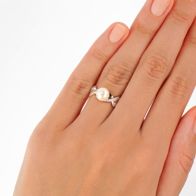 Кольцо с 18 бриллиантами природными, 0.08 карат, огранка круг 17 граней, цвет 2, чистота 2, тип огранки А; 1 жемчугом пресноводным культивированным белым; Розовое золото 585 пробы.