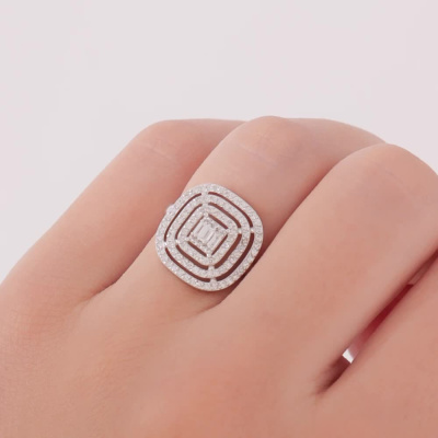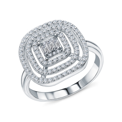 Кольцо с 3 бриллиантами природными, 0.11 карат, огранка багет 25 граней, цвет 3, чистота 5, тип огранки А; 98 бриллиантами природными, 0.39 карат, огранка круг 17 граней, цвет 2, чистота 3, тип огранки А; Белое золото 585 пробы.