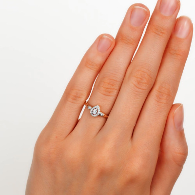 Кольцо с 1 бриллиантом природным, 0.008 карат, огранка круг 57 граней, цвет 3, чистота 6; 2 бриллиантами природными, 0.008 карат, огранка круг 17 граней, цвет 2, чистота 2; 14 бриллиантами природными, 0.04 карат, огранка круг 17 граней, цвет 2, чистота 2; Розовое и белое золото 585 пробы.