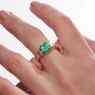 Золотое кольцо с бриллиантами выращенными и изумрудами выращенными
