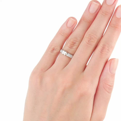 Кольцо с 1 бриллиантом природным, 0.1 карат, огранка круг 57 граней, цвет 3, чистота 6, тип огранки А; 26 бриллиантами природными, 0.07 карат, огранка круг 57 граней, цвет 3, чистота 6, тип огранки А; Платина 950 пробы.