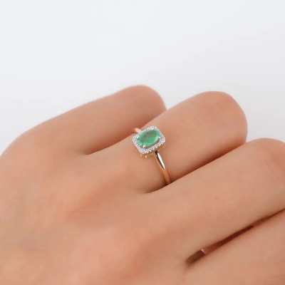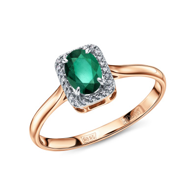 Кольцо с 24 бриллиантами природными, 0.04 карат, огранка круг 17 граней, цвет 2, чистота 2, тип огранки А; 1 изумрудом природным, 0.43 карат, цвет 3, чистота 3, тип огранки Б; Розовое золото 585 пробы.