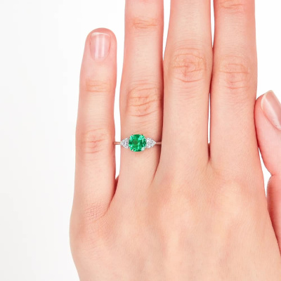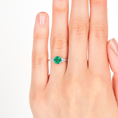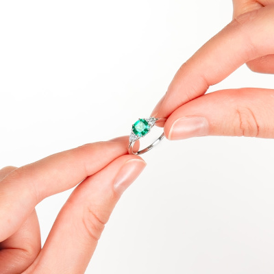 Кольцо с 1 изумрудом выращенным Колумбия, 0.81 карат; 2 бриллиантами выращенными, 0.29 карат, цвет 3, чистота 5, тип огранки А; Белое золото 585 пробы.