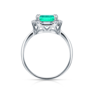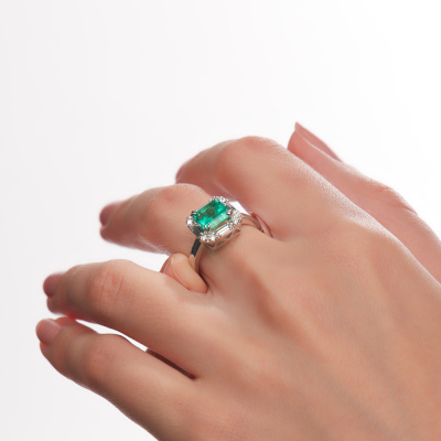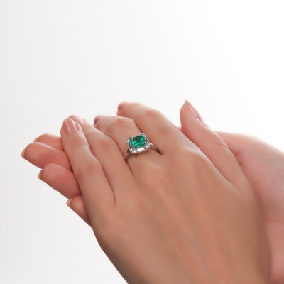 Кольцо с 1 изумрудом выращенным Колумбия, 1.46 карат; 4 бриллиантами выращенными, 0.45 карат, огранка багет 33 грани, цвет 3, чистота 6, тип огранки А; 8 бриллиантами выращенными, 0.13 карат, огранка круг 57 граней, цвет 3, чистота 6, тип огранки А; Белое золото 585 пробы.