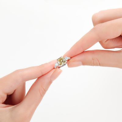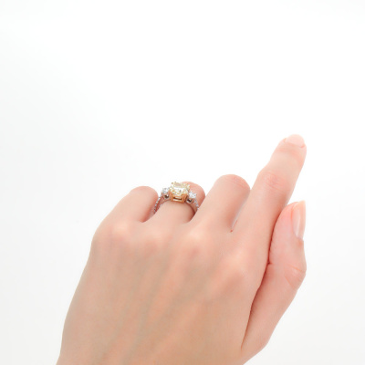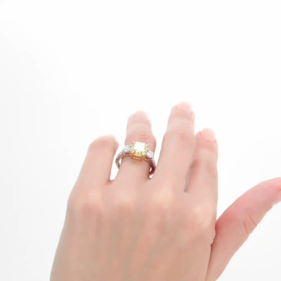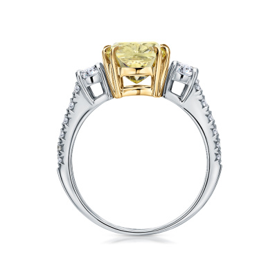Кольцо с 1 бриллиантом выращенным, 2.71 карат, огранка кушон 57 граней, цвет Желтый, чистота 5, тип огранки А; 2 бриллиантами выращенными, 0.39 карат, огранка круг 57 граней, цвет 3, чистота 5, тип огранки А; 4 бриллиантами выращенными, 0.08 карат, огранка круг 57 граней, цвет 3, чистота 5, тип огранки А; 4 бриллиантами выращенными, 0.06 карат, огранка круг 57 граней, цвет 3, чистота 4, тип огранки А; 4 бриллиантами выращенными, 0.02 карат, огранка круг 57 граней, цвет 3, чистота 5, тип огранки А; Желтое и белое золото 585 пробы.
